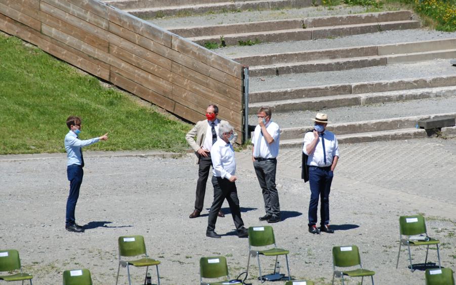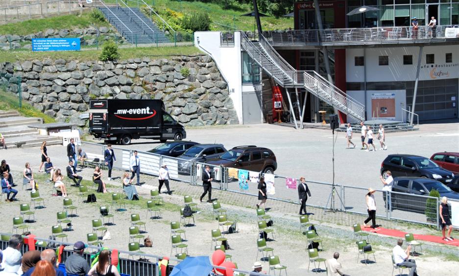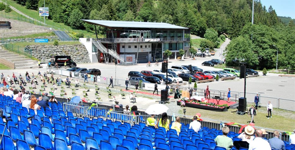 Während der gesamten Veranstaltung galten Abstandsregeln und abgesehen vom Sitzplatz auch Maskenpflicht. Die Familien saßen voneinander getrennt auf den Tribünen im Stadion. Seit dem Weltcup wurden die Sitzplätze nicht abgebaut, ideal für diese besondere Abschlussfeier.