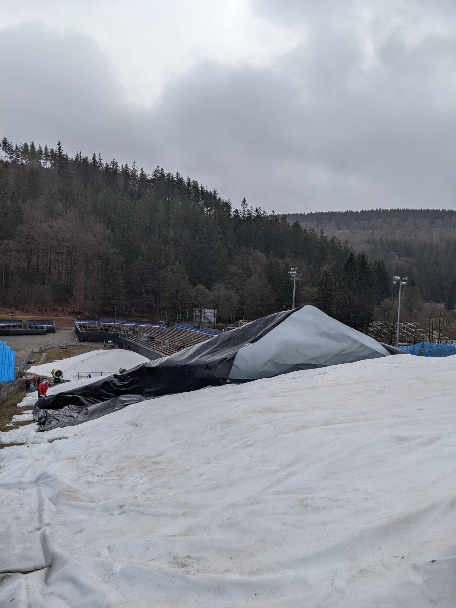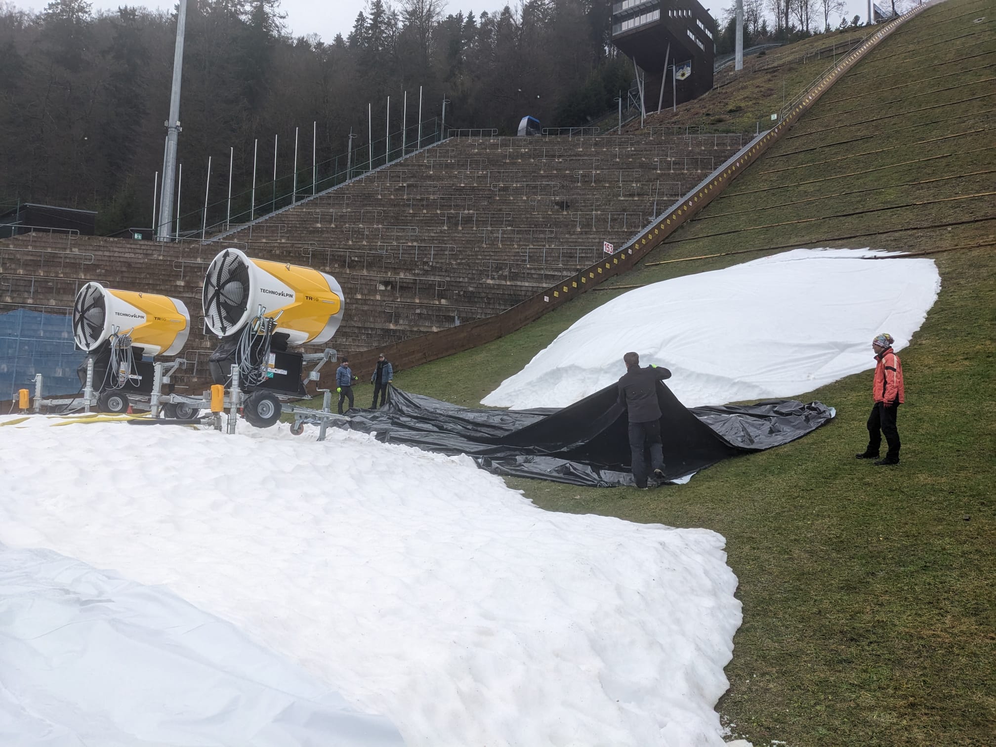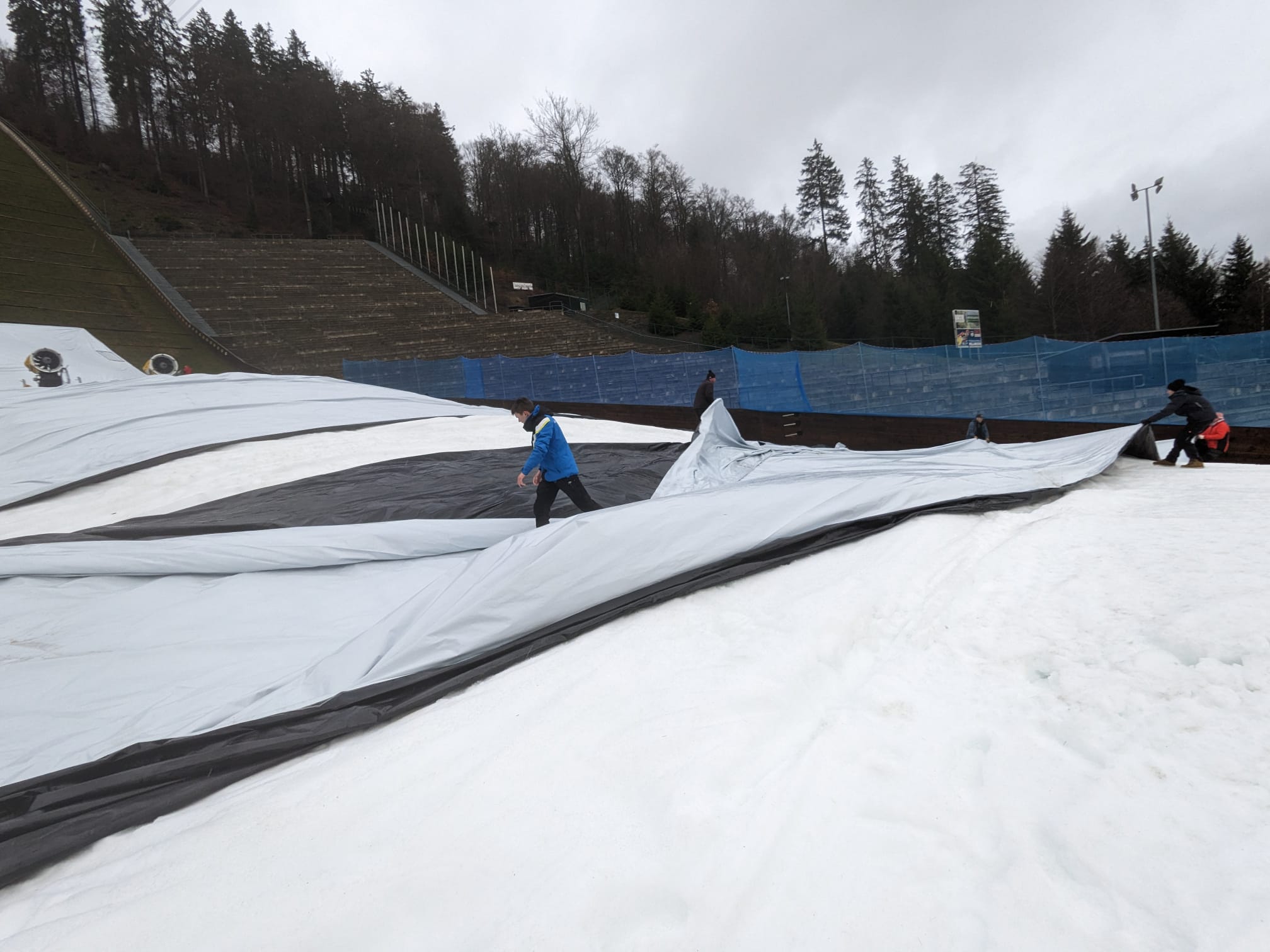 Arbeitseinsatz an der Mühlenkopfschanze - Schneedepots von Planen befreit