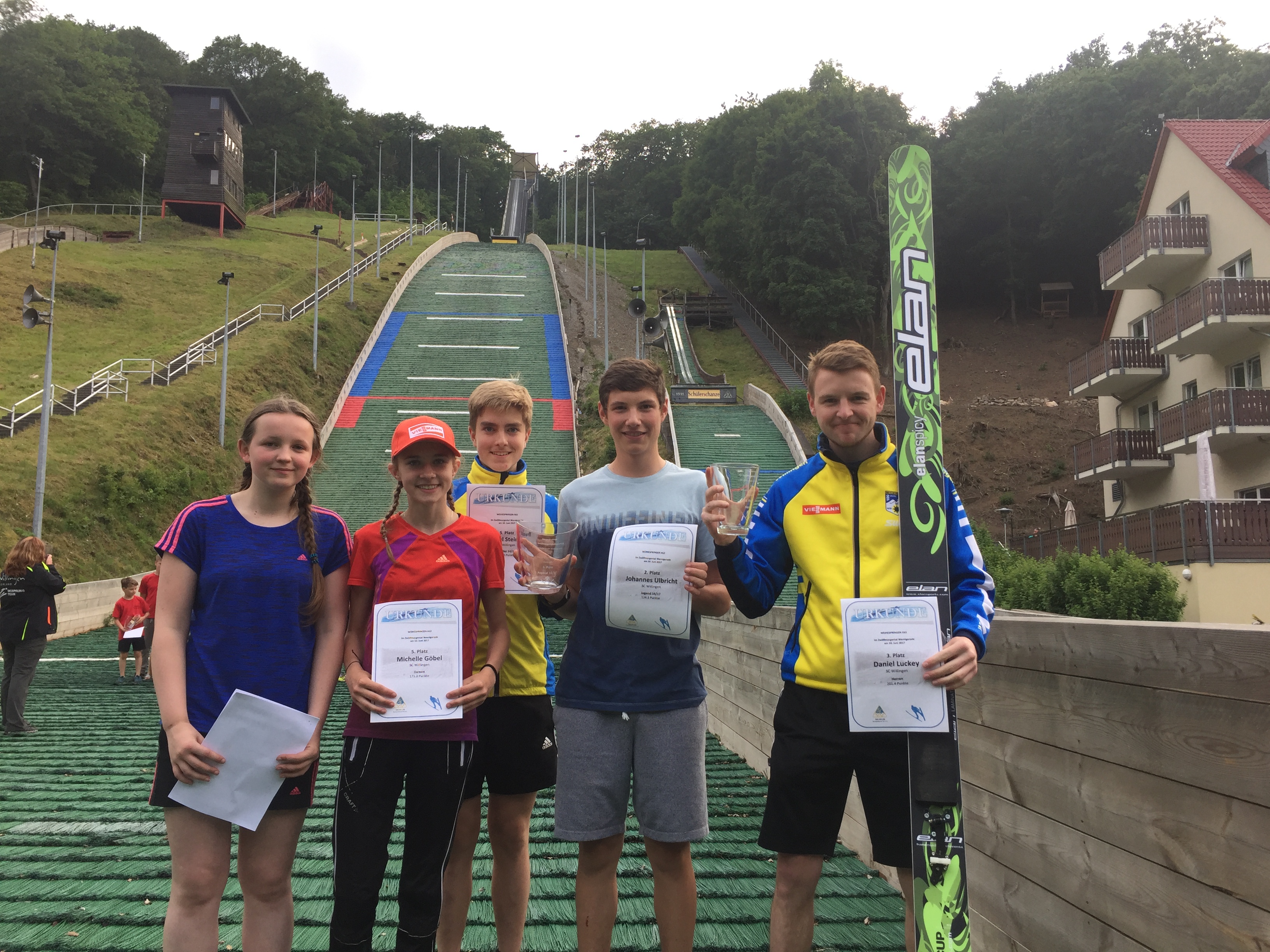 Mit fünf Skispringern des Ski-Club Willingen war Vereinstrainer Jörg Pietschmann in Wernigerode zur Einweihung der umgebauten K63-Schanze in der Schanzenanlage Zwölfmorgental am Start. Der Wettkampf war mit rund 90 Weitenjägern quantitativ und qualitativ stark besetzt, denn auch die Sportgymnasien aus Oberhof und Klingenthal schickten ihre besten Springerinnen und Springer in den Harz. Michelle Göbel vom SC Willingen wurde als jüngste Teilnehmerin bei den Damen gute Fünfte. 53 und 52,5 Meter waren ihre Weiten, wofür die junge Athletin 169,8 Punkte erhielt. Siegerin Josephine Laue (191,9 Punkte) vom SFV Rothenburg sprang in ihrem besten Versuch 58 Meter weit. In diesem Wettbewerb waren neun Nachwuchskaderathletinnen des Deutschen Skiverbandes (DSV) mit dabei. Vanessa Plonka vom SC Willingen belegte mit zweimal 40 Metern und 93,6 Punkten den 14. Rang. In der Altersklasse Schüler 14/15 kam Pascal Steinert vom SCW auf den fünften Platz. Mit zweimal 56,5 Metern und 179,8 Punkten ließ er einige Weitenjäger von den Sportgymnasien aus Thüringen und Sachsen hinter sich. Nach einer verletzungsbedingten Sprungpause von zwei Jahren war die Freude bei SCW-Adler Johannes Ulbricht über seinen zweiten Platz riesig. Erst im Frühjahr hatte er sich wieder auf die Schanze gewagt, so dass die Rückkehr zu alter Leistungsstärke sehr beindruckend ist. Mit seinen Sprüngen auf 49 und 48,5 Meter und der Gesamtnote von 134,6 Punkten musste er nur dem souveränen Sieger Camillo Hauke vom SC Traktor Oberwiesenthal den Vortritt lassen. Glücklich über seinen Podestplatz als Dritter bei den Herren war Daniel Luckey vom SC Willingen. Für 59,5 und 60 Meter erhielt der Routinier, der die neue Schanze sehr lobte, 200,9 Punkte. Der nächste Termin ist für Michelle Göbel und Vanessa Plonka das Mädchencamp der Skispringerinnen in Oberstdorf im Allgäu am kommenden Wochenende. Danach schließt sich für Michelle Göbel noch der DSV-Trainingslehrgang in Degenfeld an.