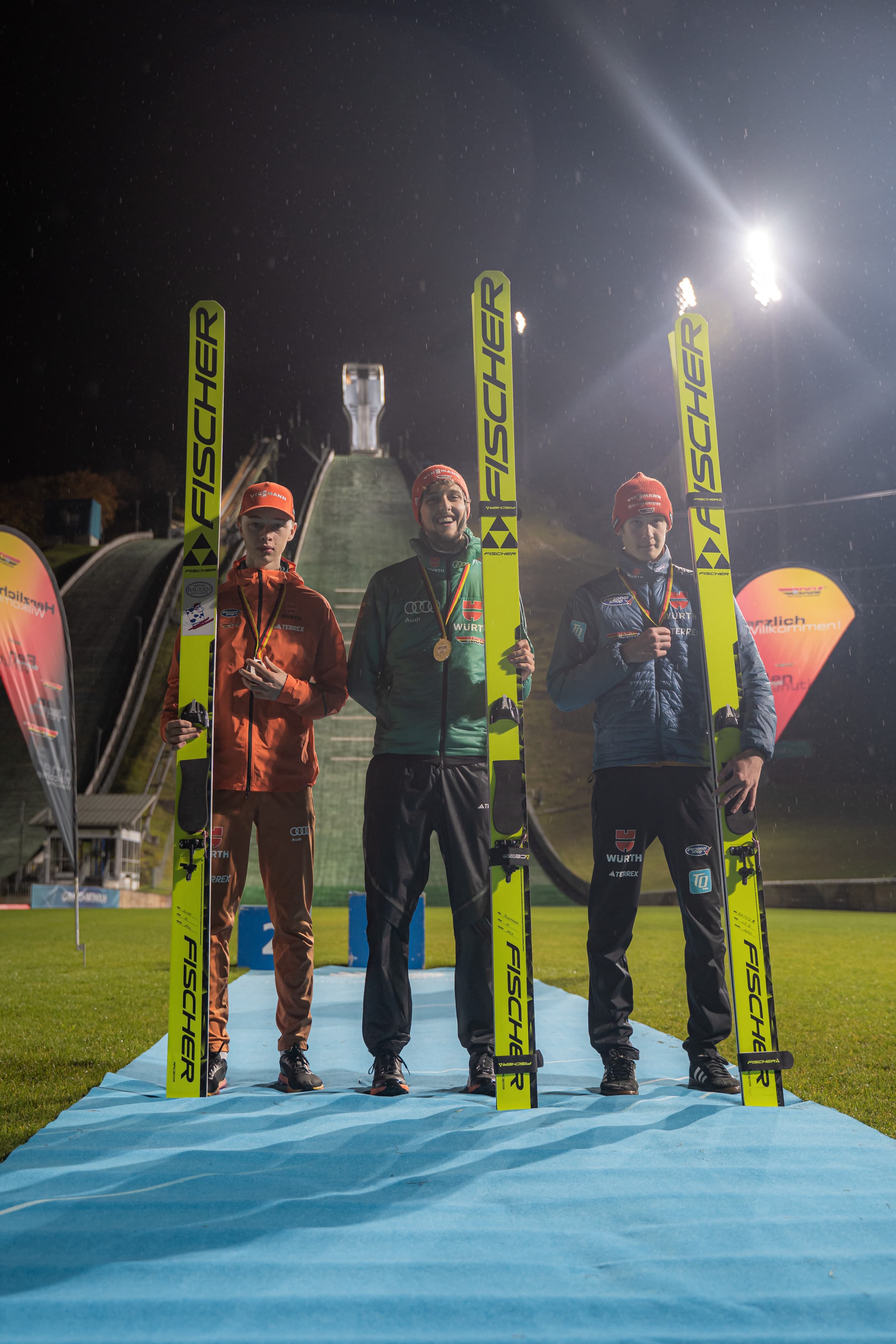 Zehn Teams bei den Herren (jeweils vier Starter) und acht Teams bei den Damen (zwei Starterinnen) gingen am zweiten Tag bei Regen ins Rennen. Für den Bayerischen Skiverband holten die Oberstdorferinnen Emely Torazza und die überragende Katharine Schmid mit souveränen 416,8 Punkten die Goldmedaille vor Thüringen (Anna-Fay Scharfenberg/Juliane Seyfarth/386,7) und Sachsen (Julina Kreibich/Selina Freitag/381,2). Bei den Herren war Bayern I in der Star-Besetzung Karl Geiger, Philipp Raimund, Pius Paschke und Überflieger Andreas Wellinger (1053,4) in anderen Sphären unterwegs als die chancenlose Konkurrenz. Den zweiten Platz holte sich Bayern II mit u.a. Constantin Schmid und Markus Eisenbichler (802,5) vor Sachsen (795,2). Das gemischte Team Hessen/Brandenburg mit Max Unglaube (WSV 1923 Bad Freienwalde) sowie den SCW-Assen Robin Kloss, Ludwig Flamme und Team-Leader Stephan Leyhe (628,0) landete auf dem fünften Platz. Mit 132 und 136m bestätigte Mühlenkopf-Weltcup-Sieger Leyhe seine tolle Frühform. Nun heißt es für ihn, den Weltcup-Auftakt in Skandinavien in den Blick zu nehmen und weiterhin an den Details zu arbeiten.