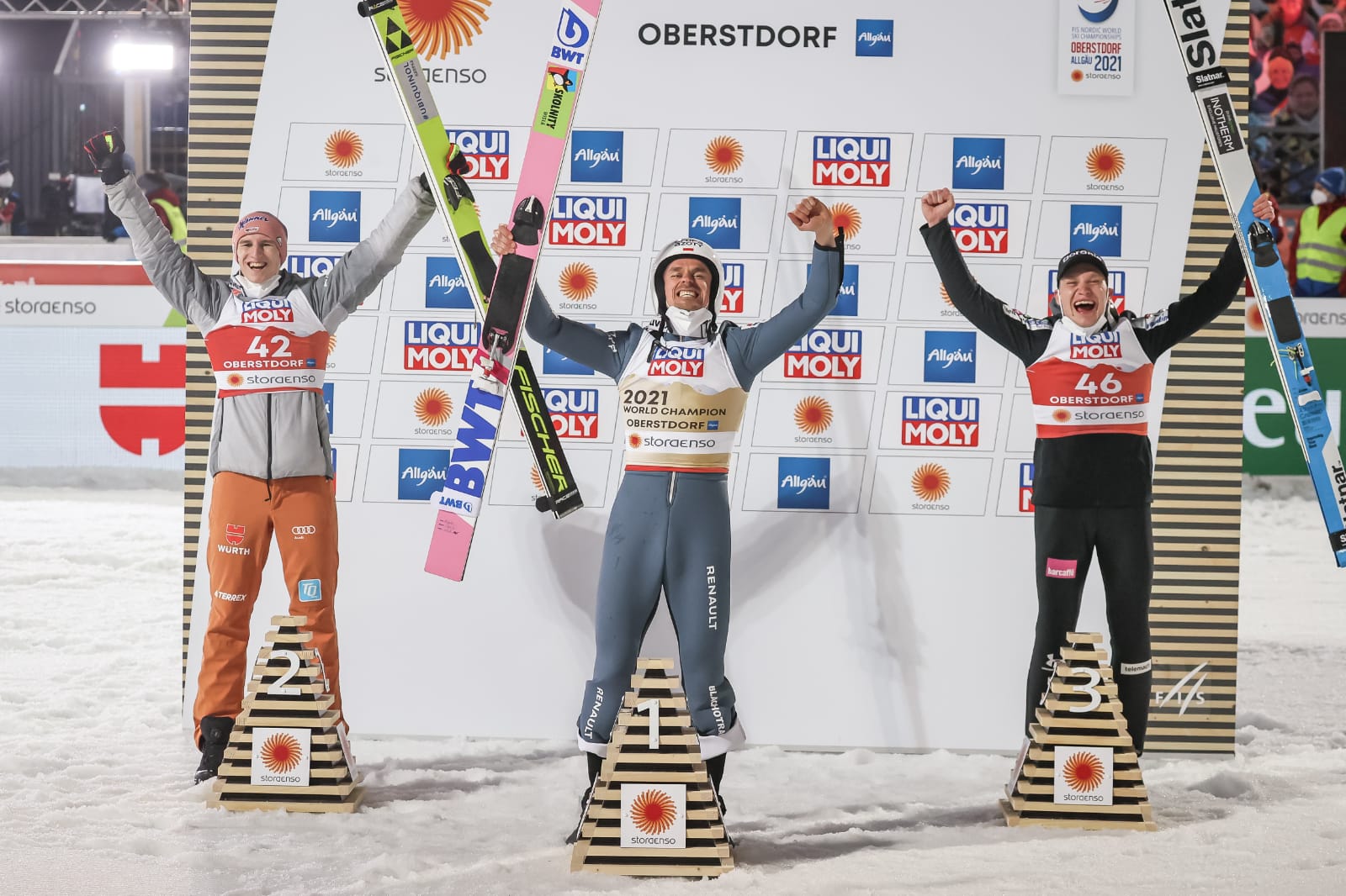 „Vor dem Wettkampf habe ich gesagt: Volle Lotte! Hopp oder Flop. Und es war Hopp", sagte Geiger, der schon Skiflug-Weltmeister und Vater geworden war und das Auftaktspringen bei der Vierschanzentournee im Allgäu für sich entschieden hatte. Auch Bundestrainer Stefan Horngacher war nach dem Krimi erleichtert: "Wir sind alle überglücklich, dass wir beim ersten Wettkampf schon eine Medaille gewonnen haben. Karls zweiter Sprung war eine echte Bombe." Der im Schwarzwald lebende Österreicher gratulierte aber auch den Polen, die er bis vor zwei Jahren trainiert hatte. „Piotr hat verdient gewonnen. Ich freue mich auch für ihn.“