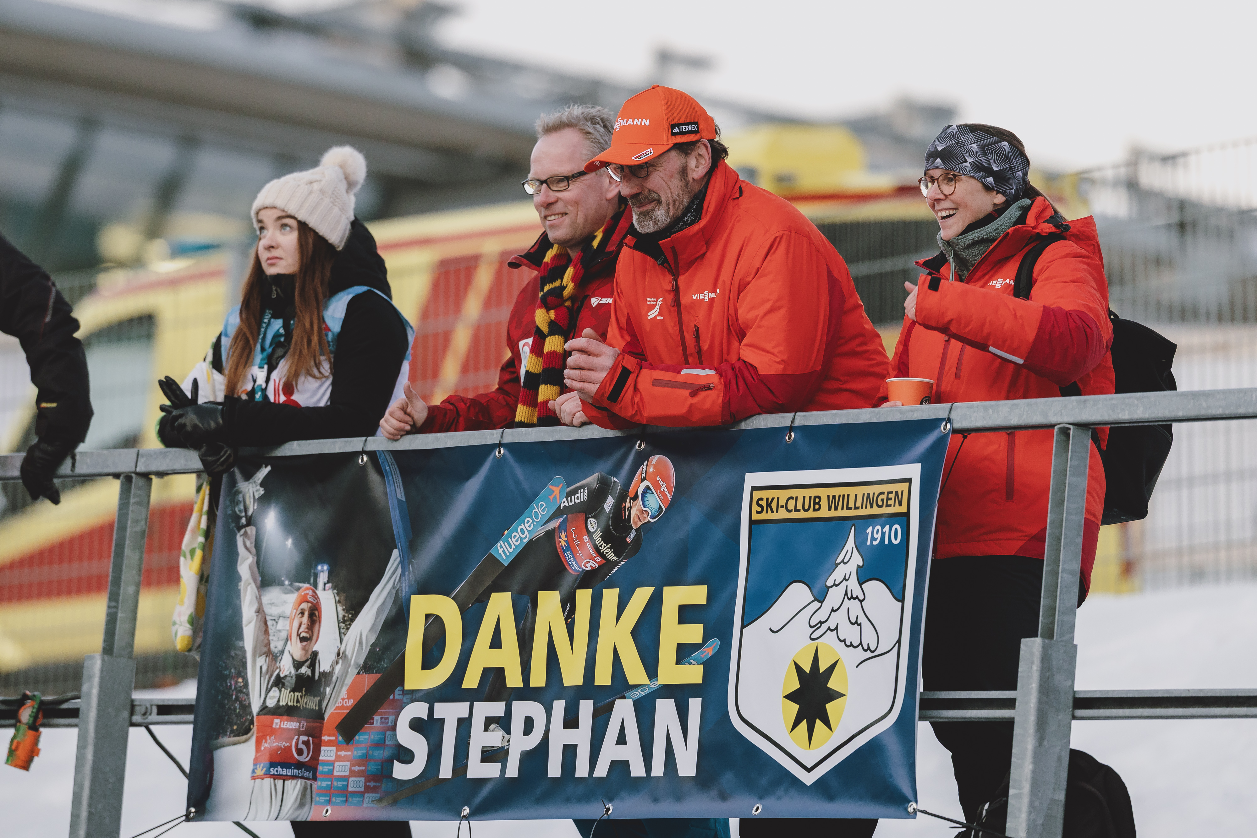 Jörg Pietschmann winkt Stephan an der Seite des Bundestrainers mit der Ski-Club-Fahne ab