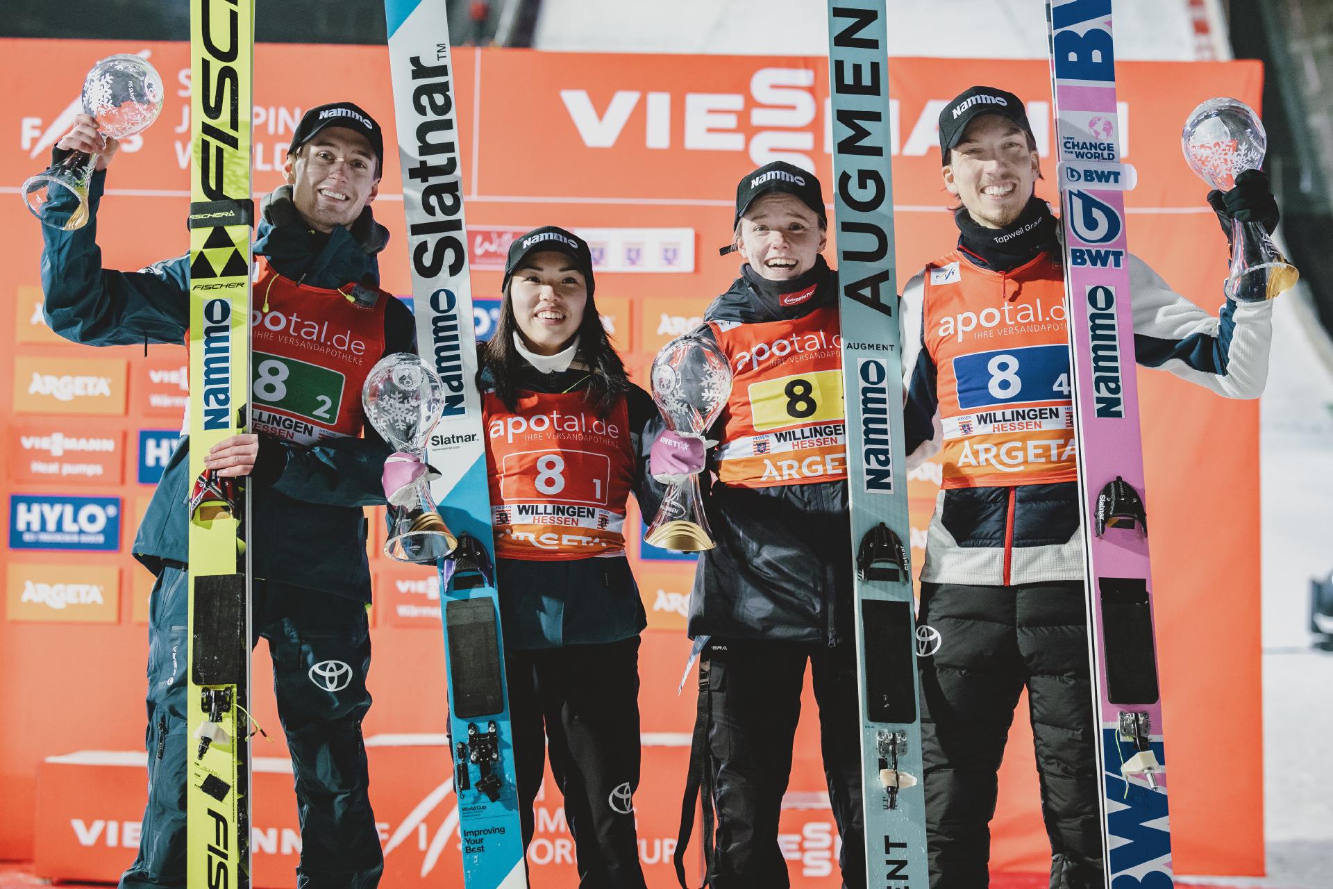 "Die Stimmung war super, es hat Riesenspaß gemacht hier zu springen vor diesem Publikum. Meine Sprünge waren okay, aber noch nicht auf Topniveau. Ich glaube, wir haben alle ein bisschen was liegen lassen, können jedoch mit dem dritten Platz zufrieden sein", bilanzierte Katharina Schmid im Anschluss. "Heimweltcup und Willingen ist immer etwas Besonderes. Für Freitagnachmittag ist hier schon echt viel los gewesen, es war heute schon coole Stimmung. Ein paar Meter fehlen uns noch, die werden wir versuchen morgen rauszukitzeln", zeigte sich Andreas Wellinger voller Vorfreude und Motivation mit Blick auf das Wochenende. Die hoch gehandelten Slowenen mussten sich nach einer Disqualifikation für Timi Zajc im ersten Durchgang mit dem fünften Platz begnügen.