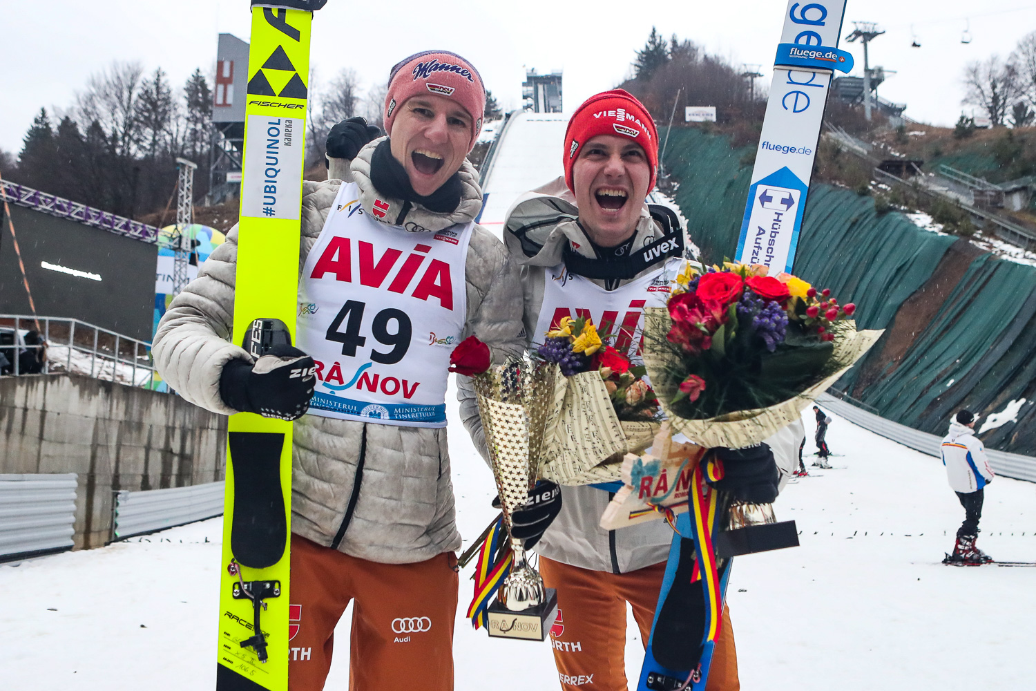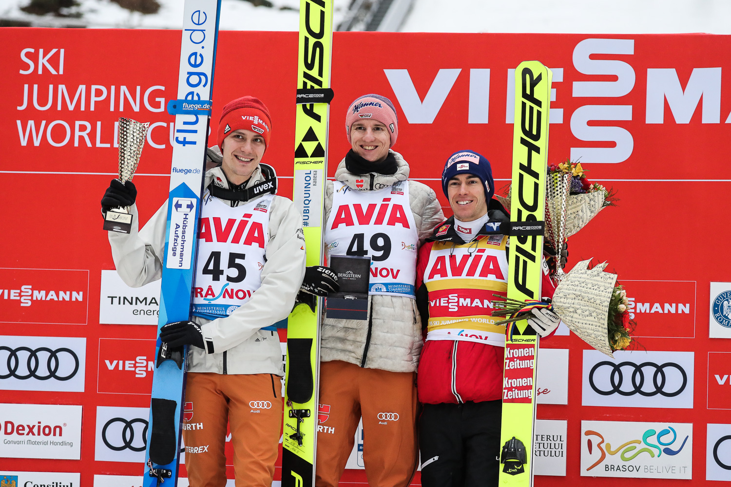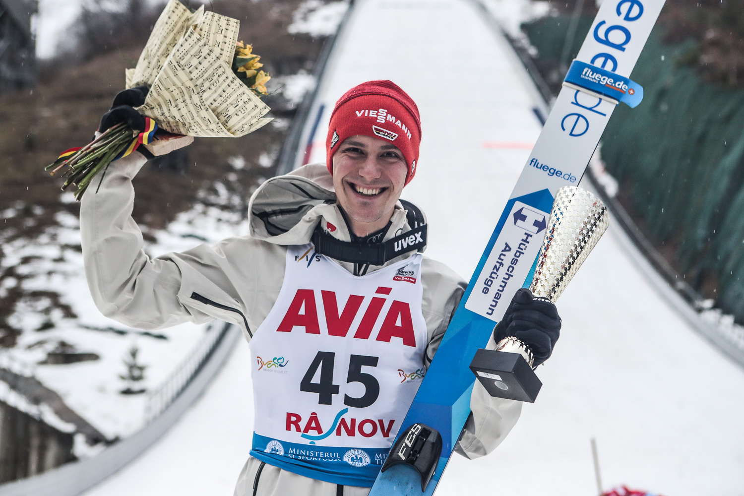 Doppelsieg für die DSV-Adler: Karl Geiger (270,3) hat den allerersten Herren-Weltcup im rumänischen Rasnov für sich entschieden und seine Qualitäten auf den kleinen Schanzen nach Val di Fiemme erneut unter Beweis gestellt. Der Allgäuer sprang auf zweimal 100 Meter und gewann damit alle drei Wettbewerben in diesem Winter auf der Normalschanze. Hinter Geiger erreichte Willingen-Sieger Stephan Leyhe (264,9/99 und 97,5 Meter) den vierten Podestplatz seiner Karriere vor dem österreichischen Weltcup-Spitzenreiter Stefan Kraft (264,5/98 und 97,5 Meter), auf den Geiger im Gesamt-Weltcup so 40 Punkte gut machen konnte.