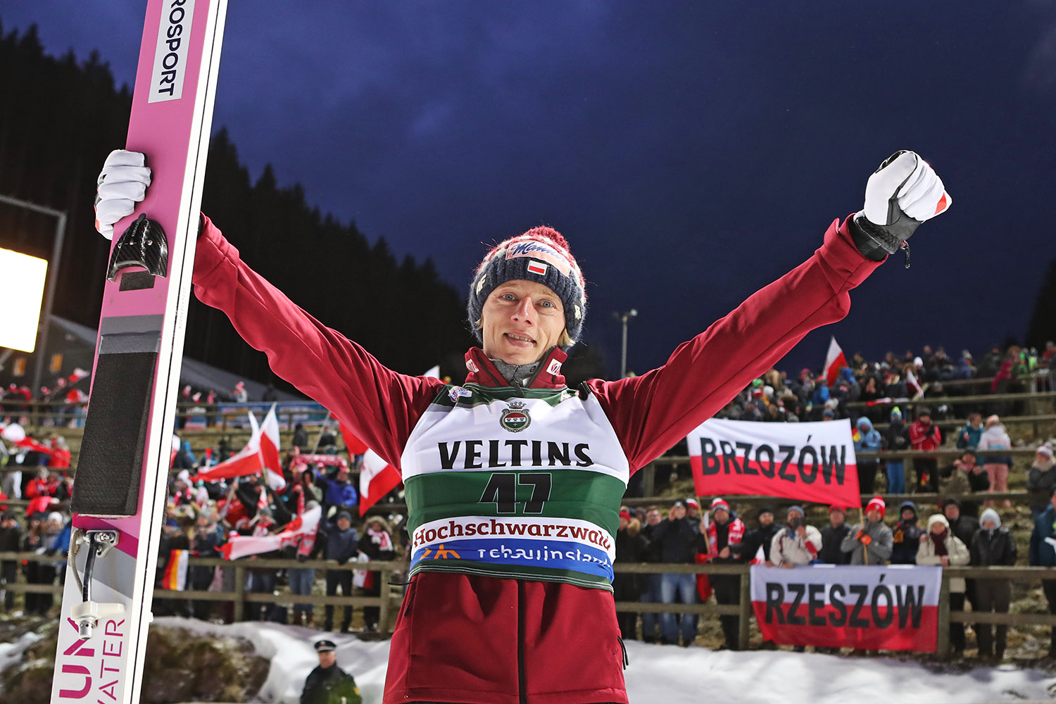 Karl Geiger (266,2/137,5+134) hat das Gelbe Trikot beim Heim-Weltcup in Titisee-Neustadt verteidigt und der Upland-Adler Stephan Leyhe (269,2/135+140,5) war als Vierter noch einen Platz vor dem Allgäuer wieder ganz nahe am Podest. Dem 26 Jahre alten Allgäuer (137,5 und 134 Meter) reichte am Sonntag vor 7000 Zuschauern ein fünfter Platz, um seinen Spitzenplatz vor dem Österreicher Stefan Kraft zu behaupten und die Führung auszubauen. Geigers Vorsprung beträgt nun 83 Punkte. Den Tagessieg holte der polnische Tournee-Gewinner Dawid Kubacki, der 143,5 und 133,5 Meter weit sprang. Ryoyu Kobayashi musste sich trotz eines Fabelsprungs auf 147 Meter geschlagen geben, ihm fehlten 0,3 Punkte. An den Japaner gingen dafür 25 000 Euro Prämie für den besten Skispringer des Wochenendes.