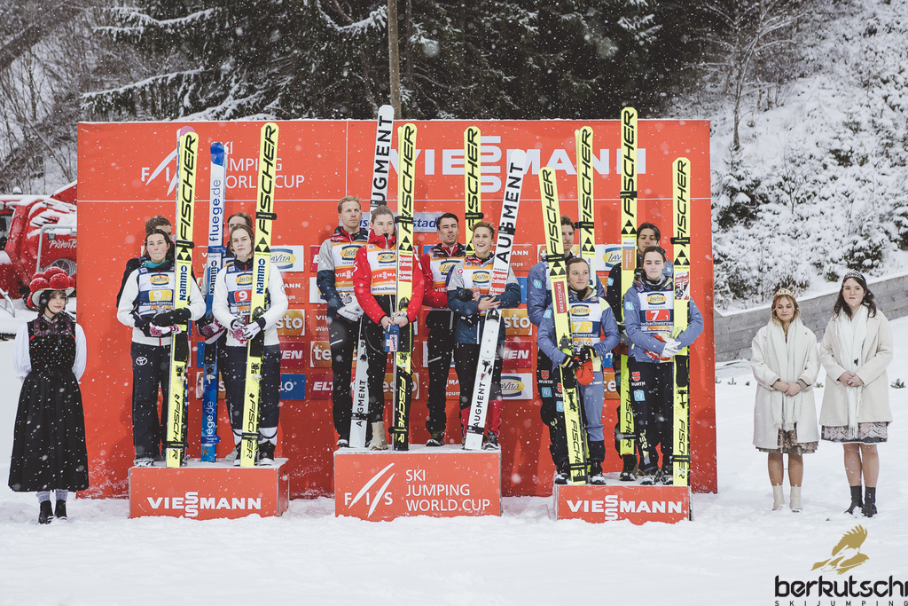 Das deutsche Skisprung-Team hat beim ersten Mixed-Team-Wettbewerb des Winters auf der Hochfirst-Schanze in Titisee-Neustadt das Podest erreicht. Karl Geiger (130,5+134), Constantin Schmid (129,5+128), Katharina Althaus (131+130) und Selina Freitag (121,5+128,5) kamen nit 954,1 Punkten im Schwarzwald auf den dritten Platz. Der Sieg ging mit 985,9 Punkten deutlich an Österreich mit Stefan Kraft, Michael Hayboeck, Marita Kramer und Eva Pinkelnig vor Norwegen mit Bendik Jakobsen Heggi, Halvor Egner Granerud, Anna Odine Stroem und Silje Opseth (959,2). Deutschland fehlten umgerechnet knapp 18 Meter zum Sieg. Das deutsche Mixed-Team hat in dem nichtolympischen Wettbewerb bei den vergangenen vier Weltmeisterschaften den Titel geholt, war aber bei der Olympiapremiere in Peking ebenso wie andere Topteams disqualifiziert worden. Auch beim Kult-Weltcup auf der Willinger Mühlenkopfschanze steht vom 3. bis 5. Februar 2023 ein Mixed-Wettbewerb auf dem Programm. Eine Delegation des Ski-Clubs Willingen ist am Wochenende in der Wahlheimat von Stephan Leyhe unter den Zuschauern. Der Upland-Adler war am Freitag auf Platz 15 gelandet und will auch am Sonntag wieder erfolgreich punkten. Karl Geiger hatte am Vortag mit Platz drei den ersten Podestplatz für die DSV-Adler im WM-Winter geschafft und für Aufwind Richtung Vierschanzentournee gesorgt.