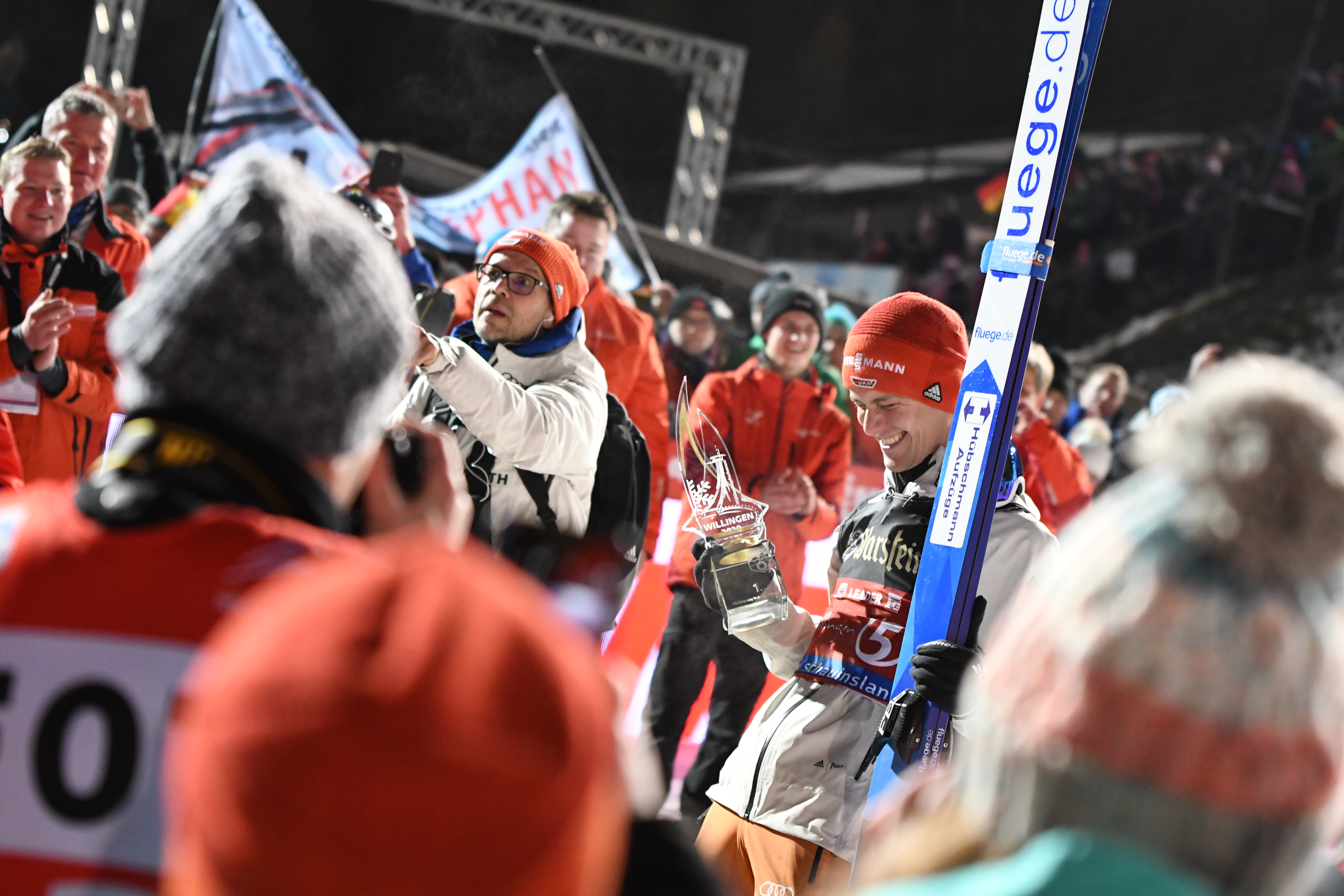 Stephan Leyhe hat bei seinem Heimspiel in Willingen seinen ersten Weltcup-Sieg gefeiert. Der 28-Jährige fing mit einem Traumsprung auf 144,5 Meter den nach dem ersten Durchgang führenden Polen Kamil Stoch noch ab und sorgte bei den 23.500 Fans an der Mühlenkopfschanze für eine Riesenfreude. Den über 1.000 „Free Willis“, wie die ehrenamtlichen Helfer im Waldecker Upland genannt werden, trieb es die Tränen in die Augen. Und OK-Chef Jürgen Hensel hielt sein Versprechen: "Wenn Stephan in Willingen gewinnt, spielen wir ihm nach der Nationalhymne auch noch das Waldecker Heimatlied." Gesagt, getan: Ausnahmezustand an der größten Großschanze der Welt in Willingen.