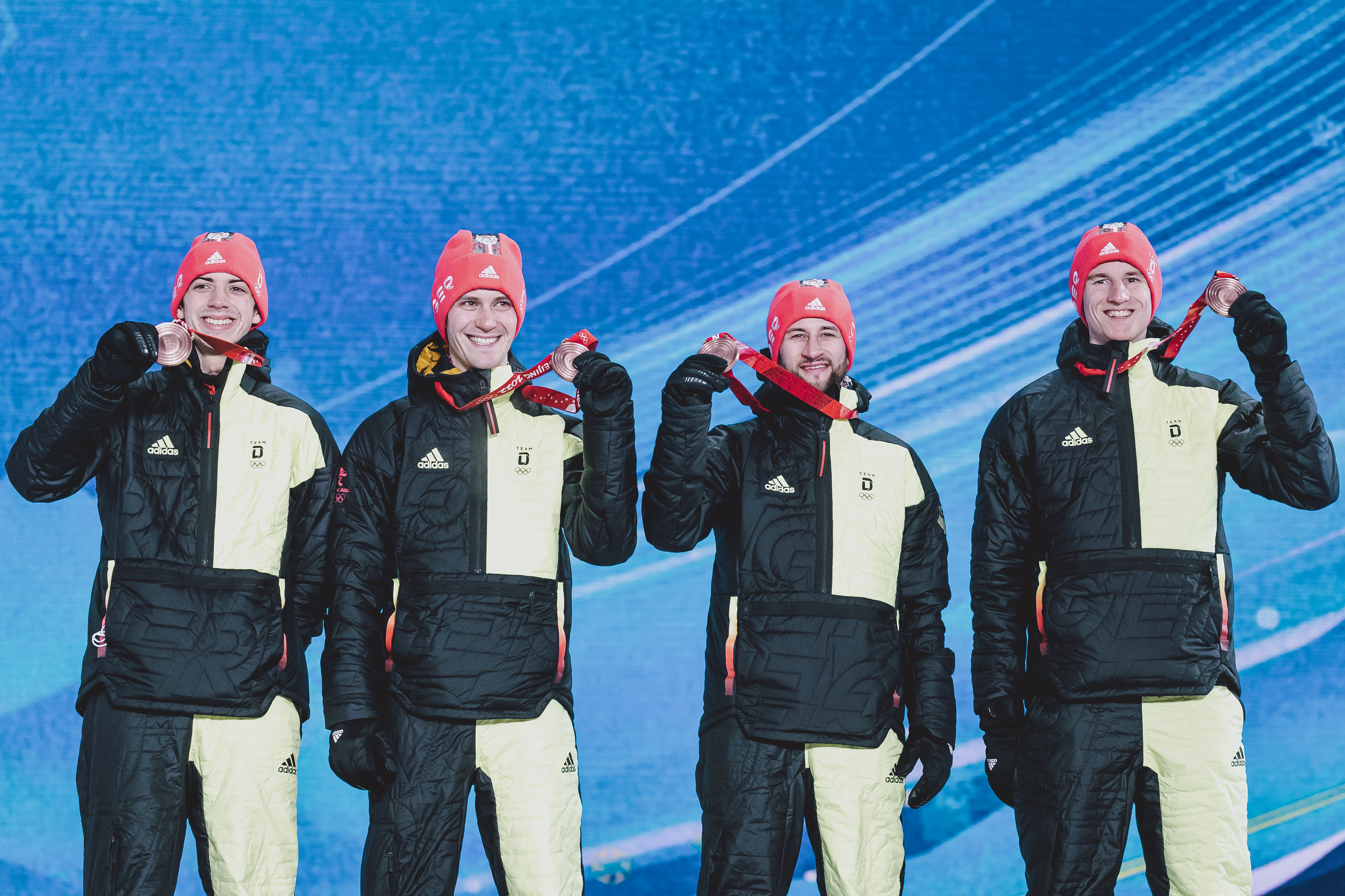 Der Jubel- Sprung auf Stufe drei des olympischen Podestes auf der Medal Plaza in Peking kloppte schon synchroner als noch bei der Flower-Präsentation im Skisprung-Stadion von Zhangjiakou.Constantin Schmid, Stephan Leyhe, Markus Eisenbichler und Karl Geiger strahlten um die Wette, als ihnen Samira Asghari, die sich als IOC-Mitglied besonders um Flüchtlingsfragen kümmert, und ein hochrangiges FIS-Mitglied aus China die Bronzemedaillen und die obligatorischen Blumen aushändigten. Nach den Slowenen um die Prevc-Brüder hüpften die ÖSV-Adler um Stefan Kraft Manuel Fettner auf das Podium. Für die Olympiasieger wurde die Österreichische Hymne gespielt. Gratulation für die Mitstreiter und Gruppenfotos beenden das strenge Protokoll und lockern die Szenerie auf. Anschließend ging es zu Sven Voss ins ZDF-Studio, auch um sich das für Studiogäste vorgesehene Stofftier abzuholen, besser zu fangen.