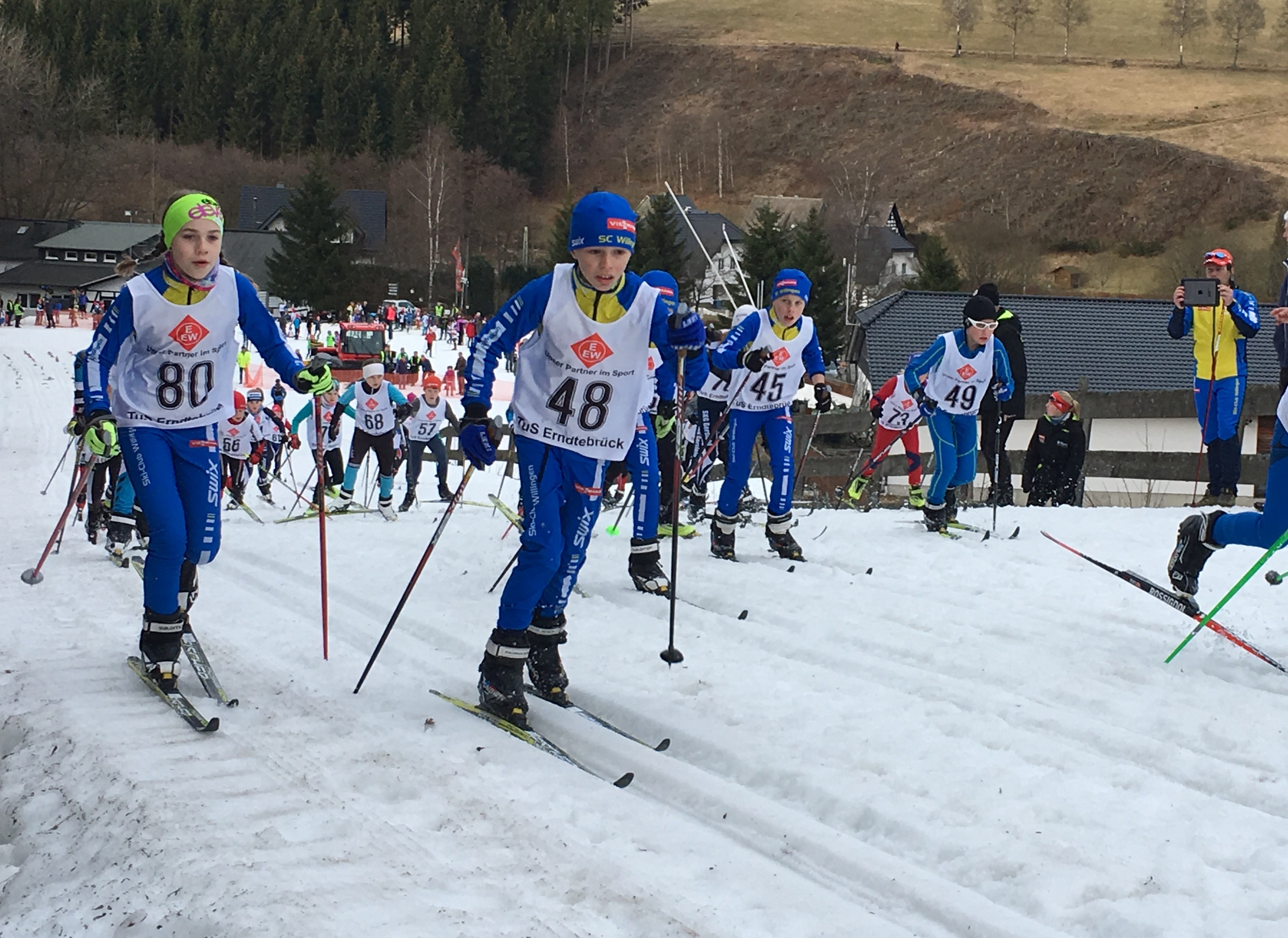 Der zweite Teil der Skilanglauftitelkämpfe des Hessischen Skiverbandes (HSV) und des Westdeutschen Skiverbandes (WSV) wurden vom TuS Erntebrück ausgerichtet, der die Wettbewerbe aufgrund der noch immer guten Schneeverhältnisse nach Westfeld verlegt hat. Das Langlaufzentrum Westfeld hat die vorhandenen Schneedepots mit großem Einsatz aufgelöst, um die Rennen auf einer bestens präparierten Zwei-Kilometer-Wettkampfstrecke durchführen zu können. Bei frühlingshafter Witterung und Temperaturen von über zehn Grad Plus gab es einen optimal organisierten Wettkampf der westfälischen Wintersportfreunde. Betreut wurden die Upländer Sportler durch Carsten Schneider, Trainer des Ski-Club Willingen, und Michael Schulenberg, Lehrertrainer der Uplandschule Willingen, die Eliteschule des Sports für den nordischen Skisport und Biathlon ist. Aufgrund der hohen Temperaturen war es eine große Herausforderung, für die jungen Athletinnen und Athleten einen griffigen Ski zu wachsen. Die anspruchsvolle Strecke ging für die jüngsten Starter über einen Kilometer, ab der Altersklasse U 9 wurde die Zwei-Kilometer-Schleife in Angriff genommen, die von den Sportlern der Altersklasse U18 als längste Distanz von zehn Kilometern fünfmal durchlaufen werden musste. Der als Massenstart aufgetragene Wettbewerb in klassischer Lauftechnik von bis zu 46 Startern in einem Startblock forderte den Aktiven nach dem Startschuss eine ganze Menge ab, um sich im weichen Schnee auf Anhieb eine gute Position für den weiteren Rennverlauf zu erarbeiten. Zweimal hatte die Jury mit DSV-Bundesstützpunktleiter Thomas Grellmann, Wettkampfleiter Otto Schlabach und Streckenchef Andreas Rath vom TuS Erntebrück und den Landestrainern Stefan Kirchner (WSV) und Torald Rein (HSV) einzuschreiten, weil Skilangläufer wegen Skatens auffielen und disqualifiziert werden mussten.
